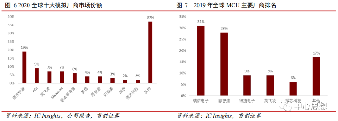 MCU也是同样情况,一直是瑞萨电子、恩智浦、得捷电子、英飞凌和微芯科技这五家公司占据行业主流,国内代表公司兆易创新、中颖电子等与之也存在较大差距。