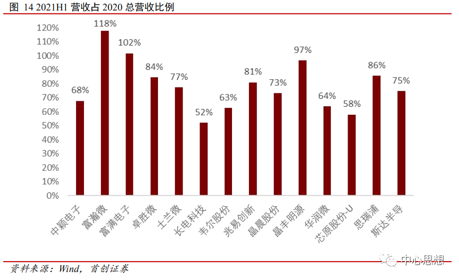 从主要半导体公司2021H1营收占2020年全年的比例来看,大部分公司2021H1收入占2020全年比重都在50%以上,富瀚微、富满电子的2021上半年收入已经超过了2020全年收入。