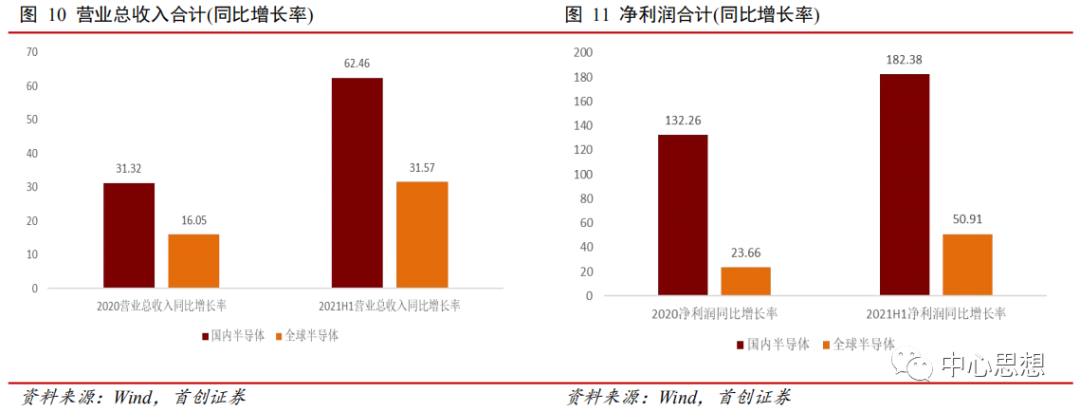 国内半导体营业总收入同比增长率无论是2021上半年的62.46%,还是2020全年的31.32%,都分别明显高于全球半导体增速的31.57%、16.05%。