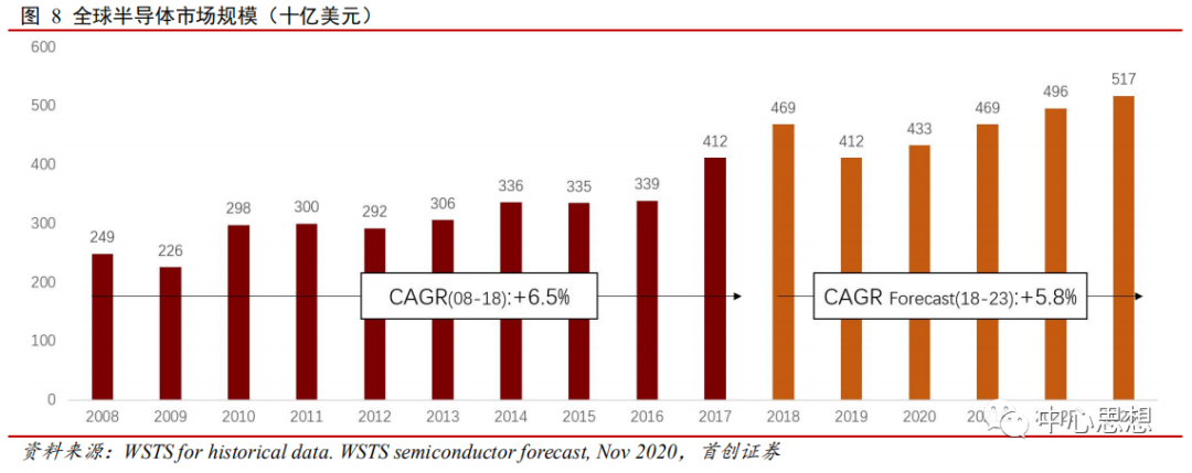 从1947年第一个晶体管发明至今,半导体已经有74年历史,是成熟行业。因此全球半导体市场规模的增速放缓,整体呈现出比较固定的局面。2020年全球半导体市场规模4330亿美元,过去20年CAGR为5.5%。