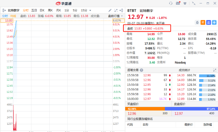 区块链概念股普涨,比特数字涨近7%,第九城市、比特矿业涨近6%,嘉楠科技、SOS涨超4%。