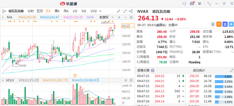 华盛资讯9月7日消息,美股盘初,诺瓦瓦克斯医药股价高开高走,截至发稿涨超5%,报264.13美元。