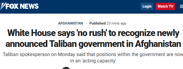 原标题:塔利班刚宣布组建新政府,白宫:美国“不急于”承认,没有时间表