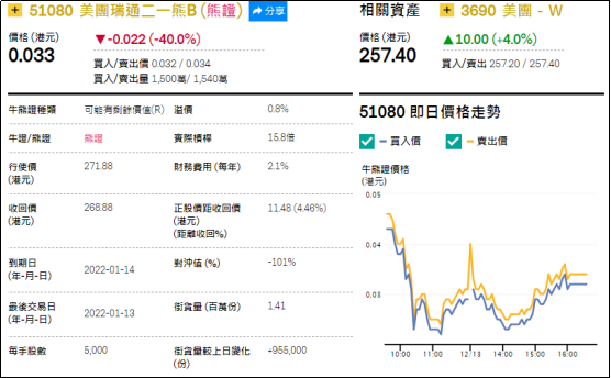 2、看错方向:美团瑞通二一熊(51080.HK),周二下跌40.0%。