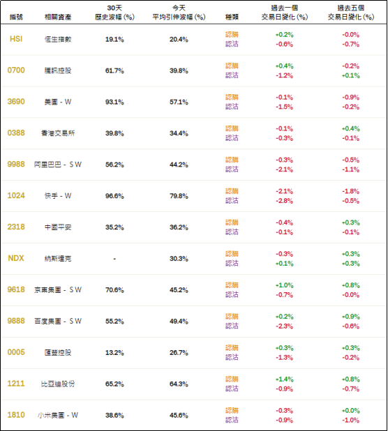 周二恒指相关权证的平均引伸波幅约20.4%,按日略有下降。个股方面,快手相关认购证及认沽证的引申波幅按日均显著调降;而腾讯、京东、百度、汇丰及比迪相关购证的引申波幅则按日有所调升。