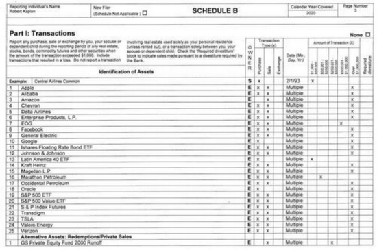 目前大多数地区联储领导人报告的金融资产比较适中,股票交易也比较小额,但根据达拉斯联储提供的一份财务披露表格显示,达拉斯联储主席罗伯特·卡普兰(Robert Kaplan)在2020年进行了多次逾百万美元的股票交易。
