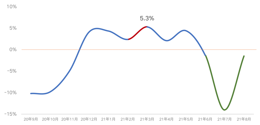 第二次是在7月底,受国家对教育等民生行业的调控影响,资本市场整体避险情绪较高,包括龙头物企在内的几乎所有物业股下跌,物业板块在6月、7月、8月股价平均涨幅分别为-1.3%、-14.0%和-1.5%,整体降至波谷。