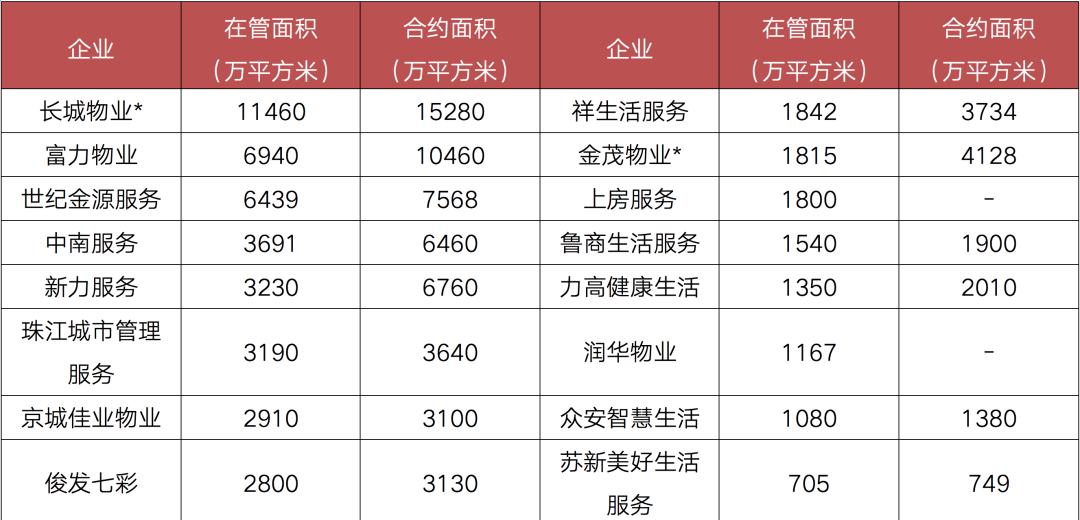 注:长城物业、金茂物业数据截止时间为2021年3月31日,表中其余企业披露在管面积、合约面积截至时间为2020年12月31日。阳光智博不纳入统计