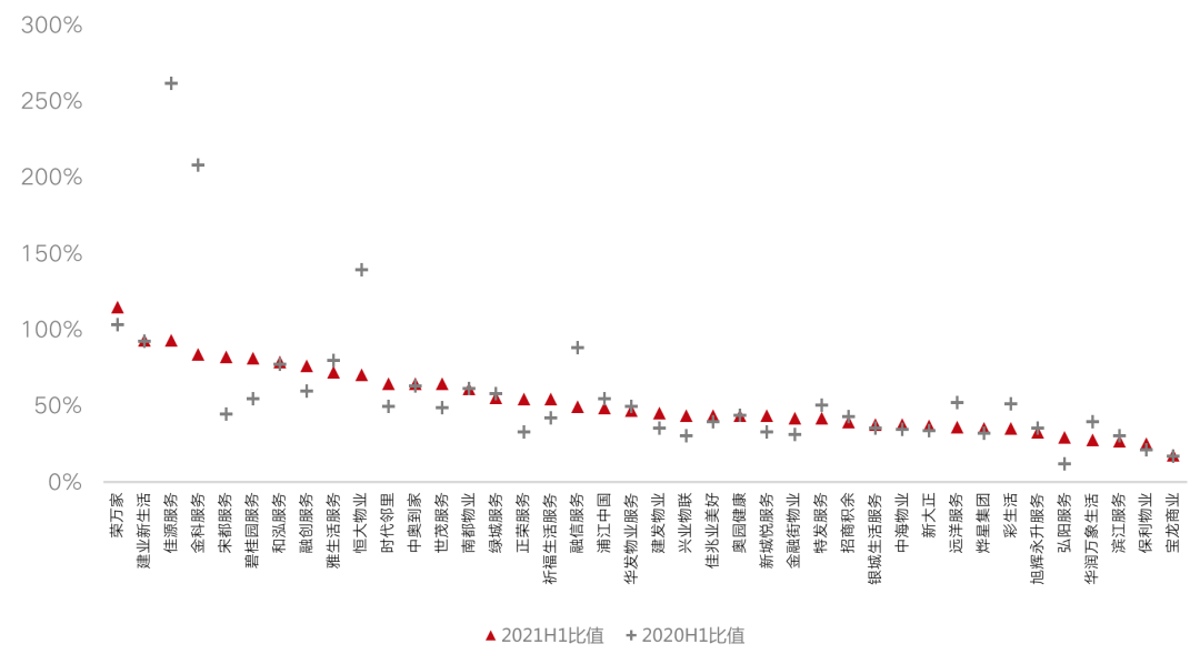 整体来看,2021年上半年上市物企应收账款/营业总额比值均值约为52.9%,低于2020上半年的60.1%,说明企业整体服务质量较去年上半年有所提升。