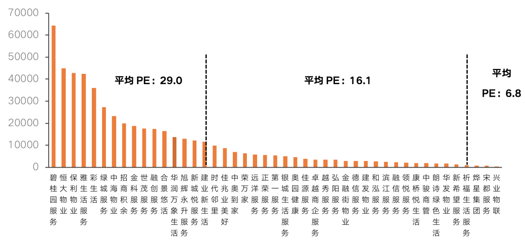 注:按在管面积大于1亿平方米、1千万至1亿平方米及小于1千万平方米划分;PE(TTM)数据截至2021/9/3数据来源:克而瑞物管整理