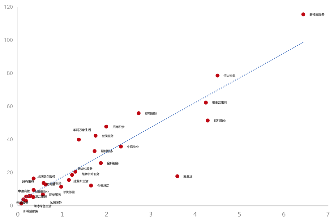 注:横轴为在管规模(亿平方米),纵轴为营收(亿元);