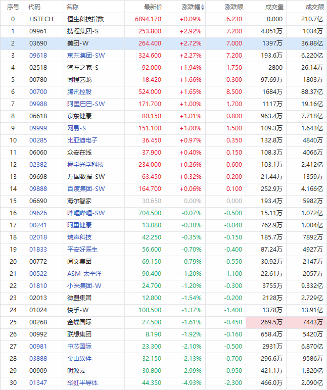 其中,携程、美团、京东涨超2%;汽车之家、同程艺龙、腾讯控股、京东健康、阿里巴巴等涨超1%;比亚迪电子、舜宇光学科技、百度集团等微涨。