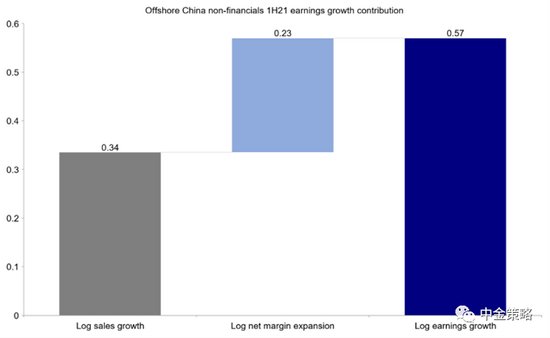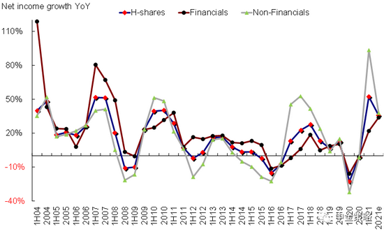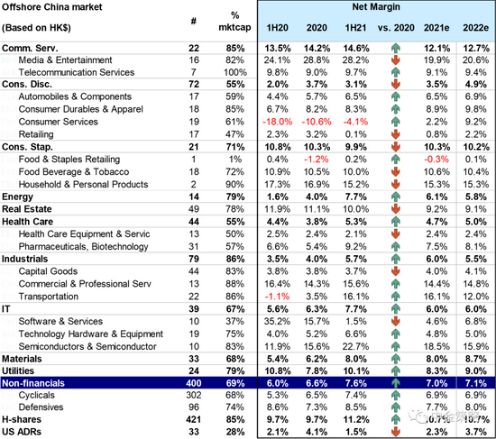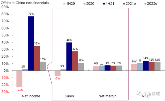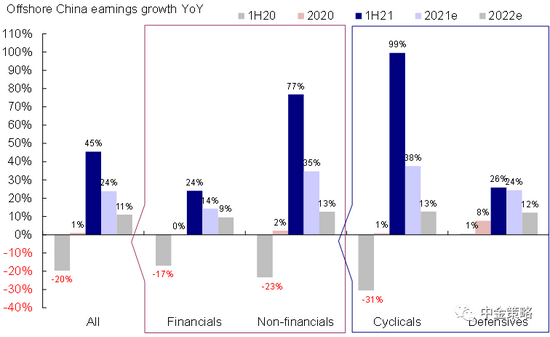 低基数效应下,海外中资股2021上半年盈利同比实现45%的高速增长。以港币并以可比口径计算,自下而上汇总海外中资股2021年上半年盈利同比增速高达45.5%(对应两年年化增长率为8.1%),较2020年全年的1.1%以及2020下半年的27.8%都进一步显著改善。