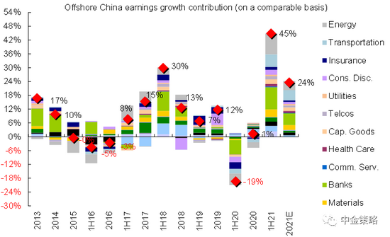 图表:能源、交运、银行板块对于2021上半年盈利增长贡献最大