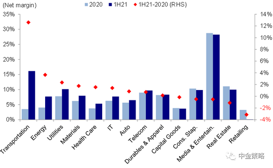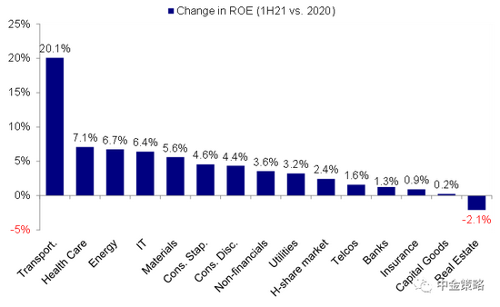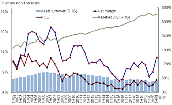 得益于上半年盈利的强势增长,非金融板块的ROE水平也从2020年的10.7%大幅上升至14.0%,杜邦分析拆解来看,主要是得益于受益于利润率及资产周转率的修复。同时,杠杆率小幅提升也对ROE起到了提振效果。行业层面,交运、原材料、能源、制药和半导体板块的ROE相比2020年水平改善幅度最大,而房地产、零售和软件板块的ROE相比2020年则有所下滑。