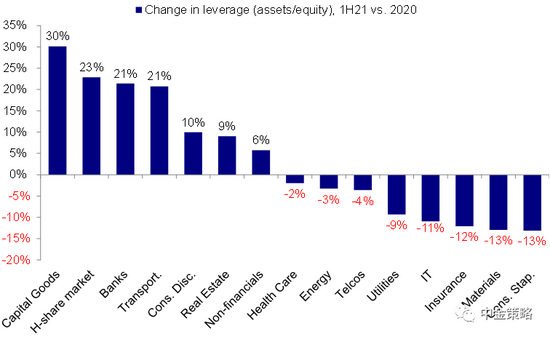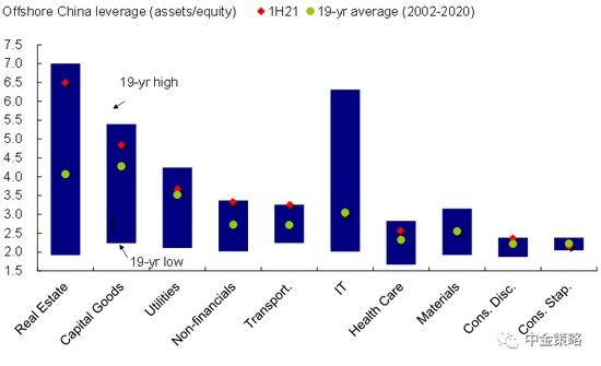 图表:房地产、资本品、公用事业和交运板块的杠杆率水平最高