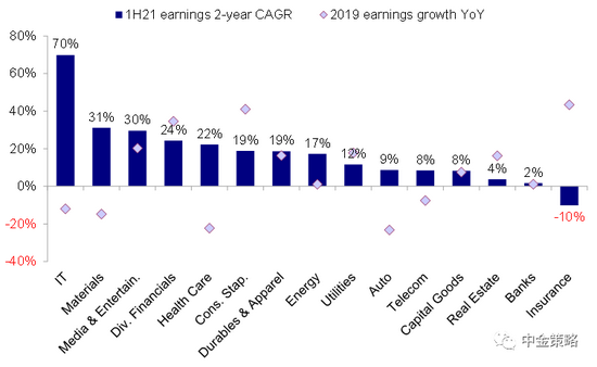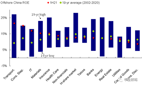 其中,非金融板块为主要驱动力(例如交通运输与能源),盈利同比高增76.8%(远高于2020年的2%及2020下半年的29.7%),对应两年年化增长率为16.4%,基本恢复至疫情前的增长趋势(2019年同比增速为17%)。