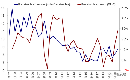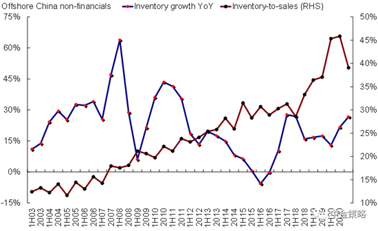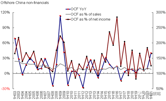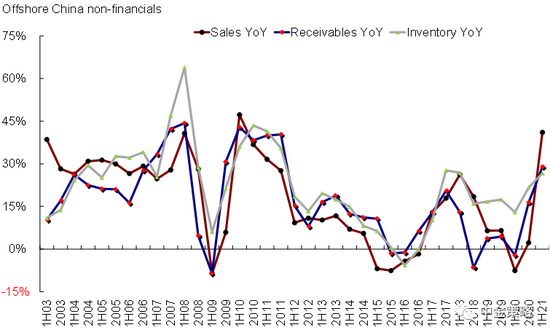 不过值得注意的是,上半年非金融企业的财务杠杆率较2020年有所抬升(从327%升至333%),也在一定程度上印证了市场对于信用问题和偿付压力的担忧。此外,2021上半年的净杠杆(负债减去在手现金与等价物)也略有提升(从41%增至43%)。行业层面,资本品、交运、可选消费的杠杆水平提升最多,必需消费、原材料、保险和IT行业的杠杆率回落最多。市场较为关注的房地产板块财务杠杆依旧明显高于历史水平。