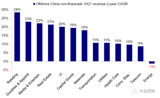 图表:除零售、保险和软件服务等少数板块外,大多数行业均实现两年年化正增长,意味着已经修复至疫情前水平