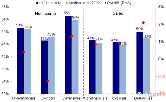 图表:2021上半年盈利完成度与历史平均水平一致,周期股略低
