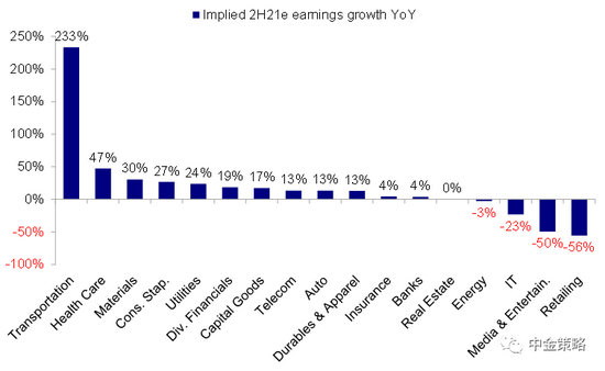 图表:从全年市场一致预期增速看,交运和医疗板块2021下半年预期盈利增速最高