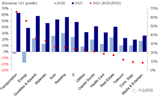 一方面,收入增长为主要驱动力,周期板块尤为强劲。相比2020年下半年,交运、能源、耐用品和服装、以及原材料板块收入增速提升幅度最大,而媒体&娱乐,房地产、电信和必需消费改善幅度相对落后。
