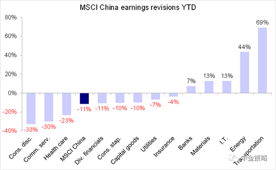图表:年初以来,可选消费与通信服务盈利预测下调最多