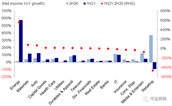 图表:相比上半年,能源与原材料板块盈利增长改善幅度最大,必需消费及保险板块下滑