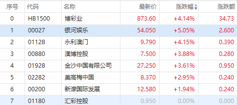 多重利好消息推动,博彩股全线走高,截至发稿,银河娱乐涨超5%,永利澳门涨超4%,金沙中国、澳博控股等涨超3%。据统计,多只博彩股自8月低位以来,股价反弹幅度皆超过20%。永利澳门从8月23日的7.68港元,最高升至9.96港元,一度涨近30%;银河娱乐从43.2港元的低位,一路反弹约25%到现在的54港元附近。