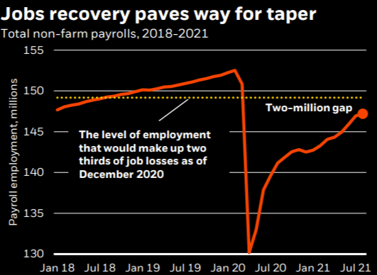 巴克莱分析师Jonathan Millar说:“8月就业增长急剧减速,少有迹象显示劳动力供应加快,这使美联储陷入两难境地,因为它要平衡需求急剧放缓的风险与供应紧张和通货膨胀的风险。我们仍然预计美联储将在9月发出缩减信号,但现在预计将在12月而不是11月开始。QE可能将在2022年中期结束。”