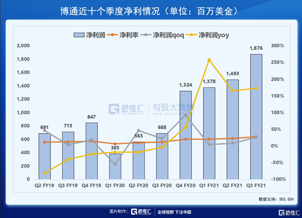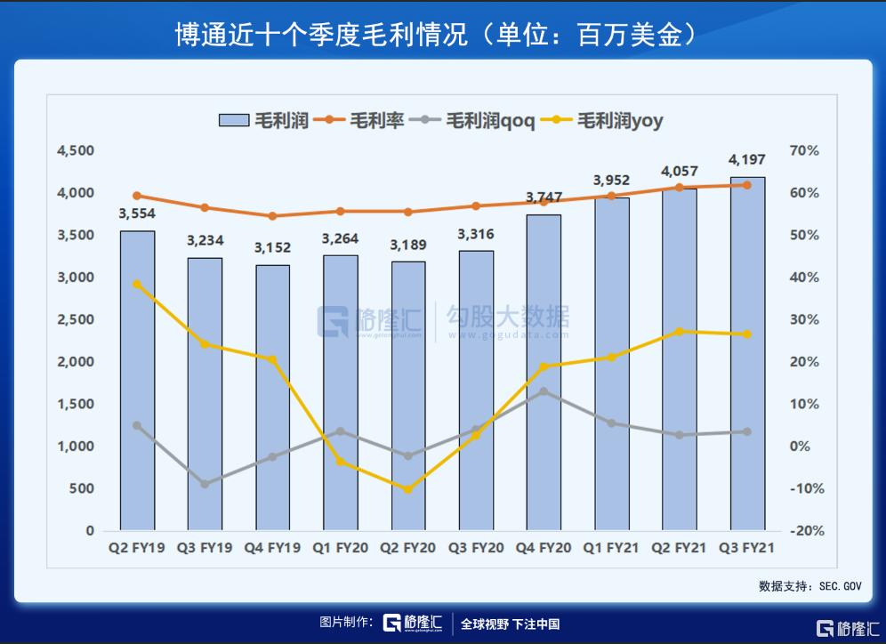 1、受益于旷日持久的全球芯片供应短缺,博通21财年Q3营收、净利均超预期,净利增长超1.7倍,半导体解决方案业务营收首次突破50亿美元大关,Q4业绩指引超预期;