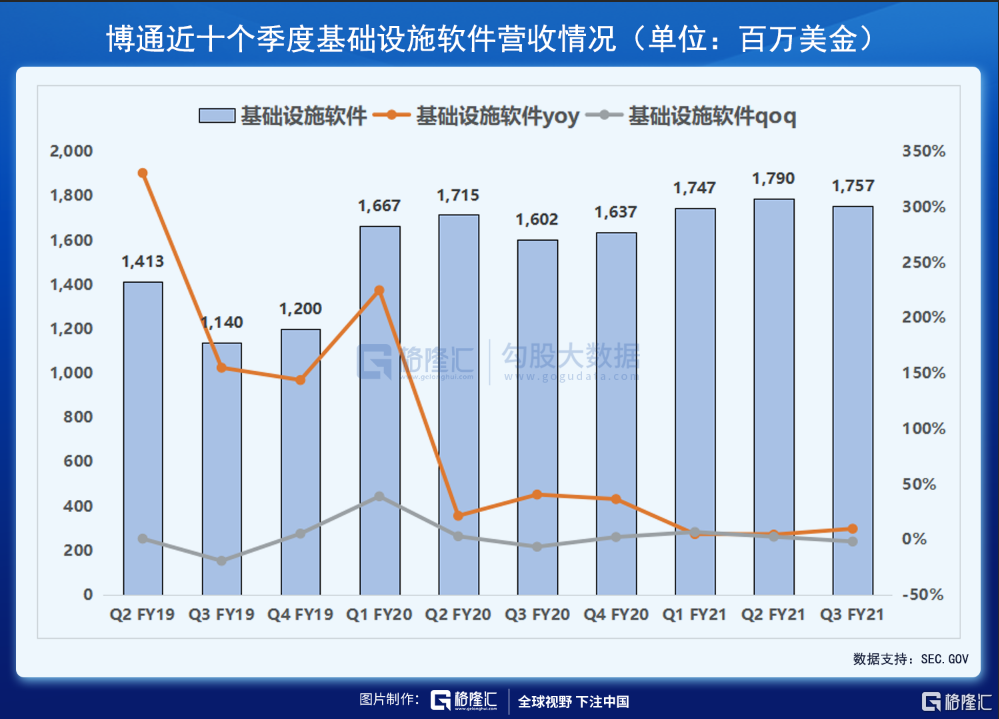 博通的网络安全解决方案组合包括终端、网络、信息和身份安全解决方案,同时还提供任务关键型FC SAN产品和相关软件。由于客户对网络安全、大型机解决方案以及对 FC SAN 产品的需求增加,Q3基础设施软件业务营收同比增9.7%至17.57亿美元。博通不断通过加大对软件业务的投资来实现收入多元化,使公司免受供应链中断的影响。在芯片行业发生任何周期性变化时,博通庞大的基础设施软件业务可能会被证明更具具持续性。