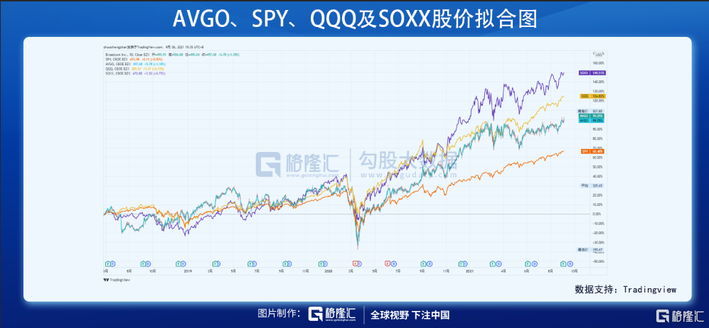 截止21年9月3日收盘,博通年内涨幅仅为15.45%,跑输同期标普500指数(SPY:21.98%)、纳指100ETF(QQQ:21.92%)及费城半导体指数(SOXX:24.57%)的涨幅。