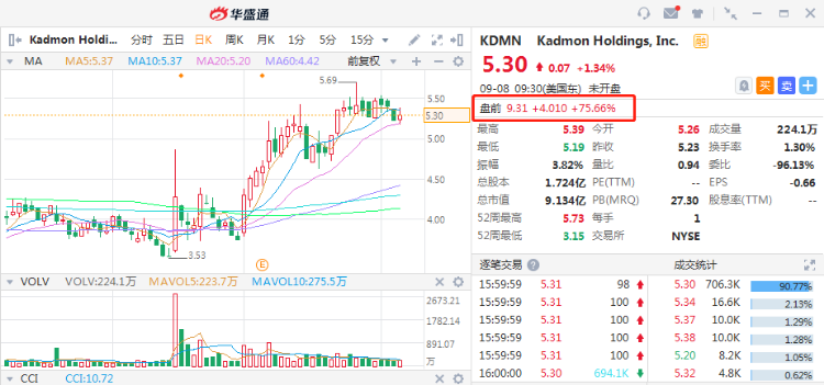 华盛资讯9月8日消息,美股盘前,美国生物技术公司Kadmon Holdings Inc.(KDMN)暴涨75.66%,报9.31美元。