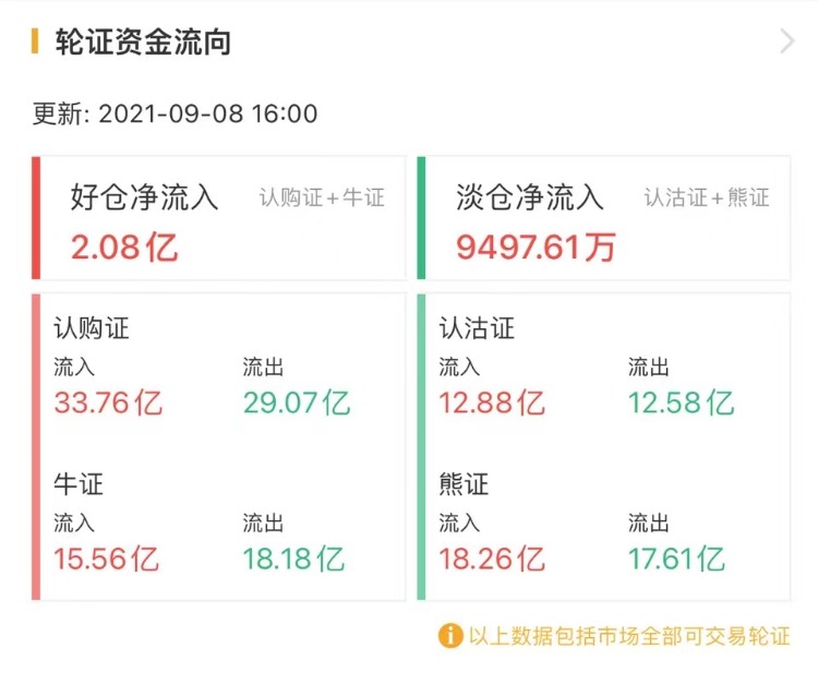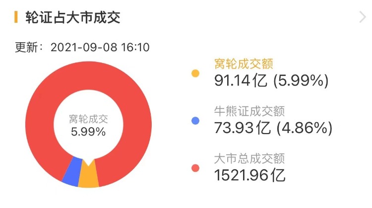 其中,窝轮总成交额91.14亿港元,牛熊证总成交额73.93亿港元。