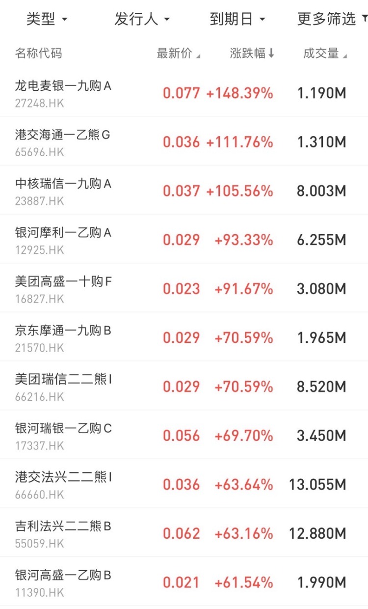 涨幅居前的包括: $27248.HK 龙电麦银一九购A涨148.39%,占据排行榜第一;$65696.HK 港交海通一乙熊G涨超111.76%; $23887.HK 中核瑞信一九购A涨105.56%。