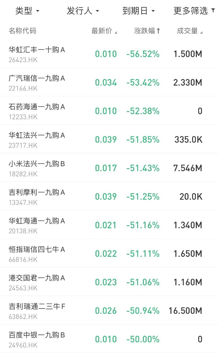 在今日跌幅榜中,$26423.HK 华虹汇丰一十购A跌56.52%; $22166.HK 广汽瑞信一九购A跌53.42%。