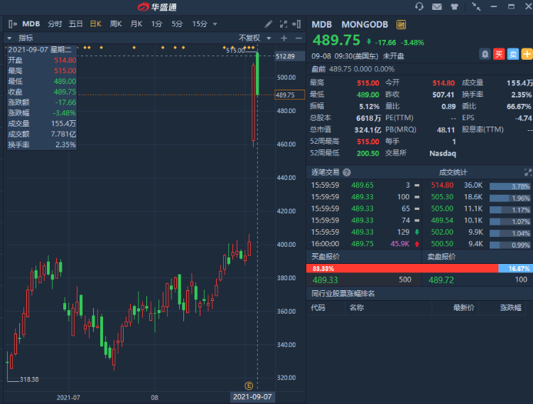 MongoDB 于上周五(9月3日)发布第二季度财报后,股价一路狂飙,盘中最高从401.65美元拉升至508.97美元,截止收盘涨幅26.33%,预计MongoDB公司2021财年的收入将在8.05亿美元至8.11亿美元之间,高于此前预测的7.84亿美元。与上一年相比将增长37%。
