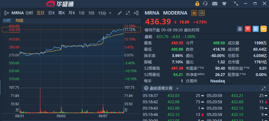 Moderna(MRNA)昨日收涨约4.8%,股价达436.39美元,该股已连续第五个交易日上涨,为5月28日以来最长涨幅,5天累涨了17.8%。