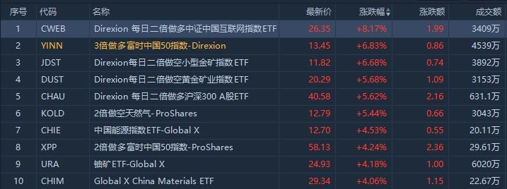 从ETF涨幅榜来看,涨幅居前的ETF集中在做多中国互联网和做空黄金。其中,每日二倍做多中证中国互联网指数ETF $CWEB 大涨8%,成交额3409万美元;3倍做多富时中国50指数ETF $YINN 涨近7%,成交额4539万美元。