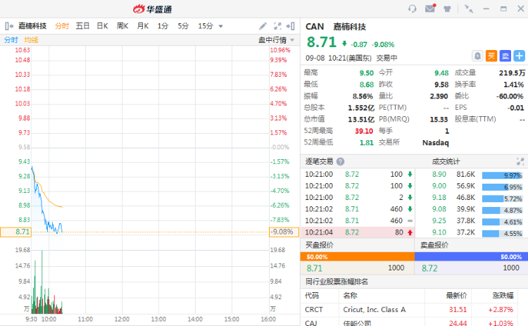 华盛资讯9月8日消息,美股盘初,美股区块链概念股延续跌势,嘉楠科技(CAN)跌超9%,第九城市(NCTY)跌近7%,比特数字(BTBT)跌近6%,Silvergate Capital(SI)跌近5%。