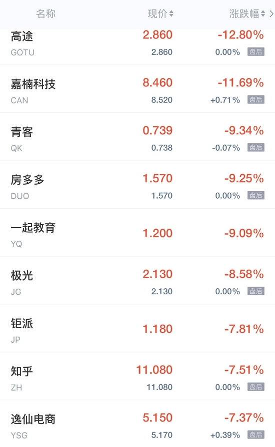 热门中概股周三收盘普遍下滑,教育股跌幅居前,网络游戏股、新能源汽车股、区块链概念股走低。