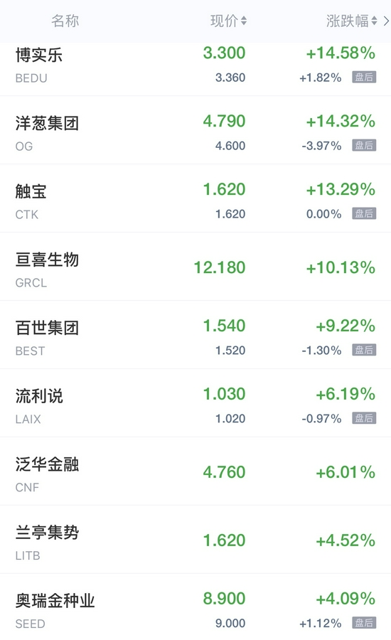 洋葱集团涨超14%,百世集团涨超9%,流利说涨超6%,兰亭集势涨超4%。