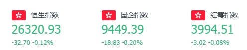 截至周三收盘,恒生指数跌32.7点或0.12%,报26320.93点,全日成交额达1521.96亿。国企指数跌0.2%,报9449.39点,红筹指数跌0.08%,报3994.51点。