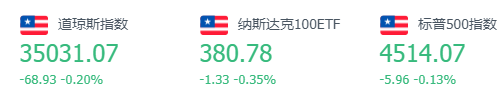 截至周三收盘,道琼斯指数跌0.20%,报35,031.07点;标普500指数跌0.13%,报4,514.07点;纳斯达克指数跌0.57%,报15,286.60点。