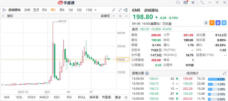 美东时间周三盘后,游戏驿站披露了第二季度财报。数据显示,该公司Q2净销售额为11.8亿美元,市场预期11.2亿美元;调整后每股亏损0.76美元,分析师预期亏损0.67美元。游戏驿站盘后一度跌超10%,截至发稿,该股跌超8%,报182美元。