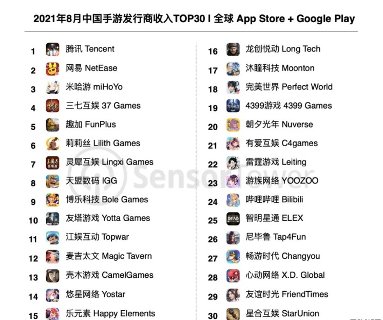 腾讯(TCEHY)、网易(NTES)和米哈游位居8月中国手游收入前三