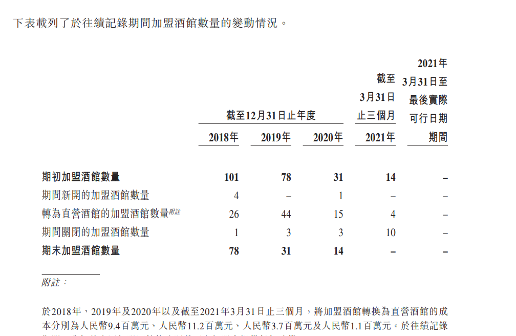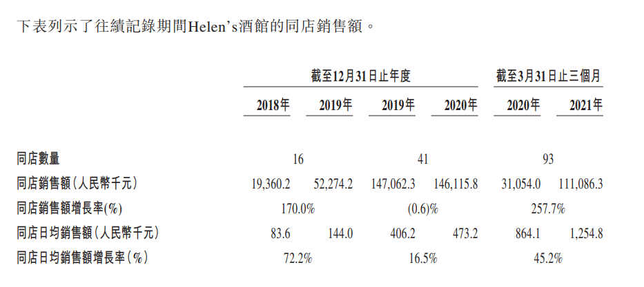 直营酒馆的直线增长带来的是同店销售额的不断攀升。海伦司以16家店为样本的同店销售额2018年为人民币1940万,增长到2019年的人民币5230万,日均同店销售额由2018年的人民币8.36万增加72.2%至2019年的人民币14.4万。以41家店为样本的同店销售额2019年为人民币1.47亿,2020年为人民币1.46亿。于2018年至2021年3月31日止三个月,日均同店销售额保持增长趋势。