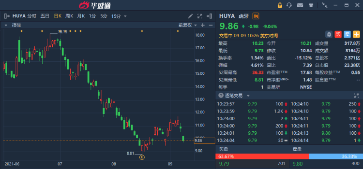 华盛资讯9月9日讯,美股早盘,部分热门中概股走低。截至发稿,虎牙(HUYA)跌超9%,迅雷(XNET)跌近6%,51talk(COE)跌近5%,途牛(TOUR)跌超2%,斗鱼(DOYU)跌超2%。