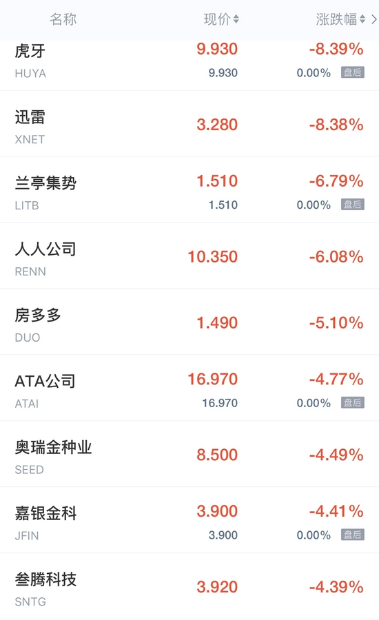 虎牙、迅雷跌超8%,兰亭集势、人人公司跌超6%,房多多跌超5%,嘉银金科、叁腾科技跌超4%,知乎、水滴公司跌超3%,腾讯ADR跌近3%,哔哩哔哩、网易、36氪、金融界、前程无忧跌超2%,斗鱼跌2%,阿里巴巴、极光、京东跌近2%,新东方、趣头条、携程、云米科技跌超1%。